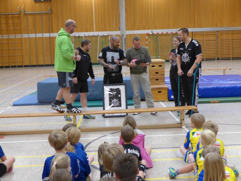 Dirk Wittig übergibt die Stüürmann-Trikots an die Handballjugend vom TSV Schülp.